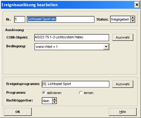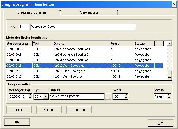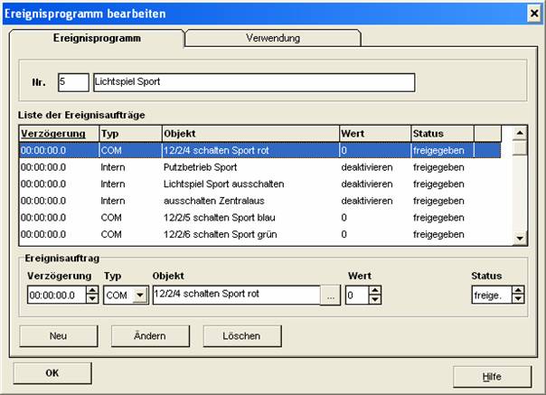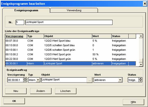 In diesem Dialog kann festgelegt werden , was welches Objekt zu welchem Zeitpunkt ab der Ereignisauslösung machen soll . Es können sowohl Schaltbefehle (1-Bit) als auch Werte (1-Byte) eingegeben werden . Die betreffenden Gruppenadressen werden direkt aus der ETS editiert und müssen somit nicht manuell eingegeben werden . Damit das Lichtspiel wie eine Endlosschleife abläuft , wurde zum Schluss das Ereignisprogramm selber wieder aktiviert :
