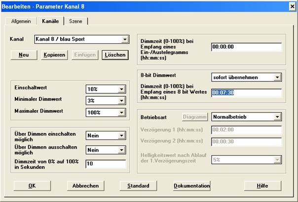 Siemens DALI-Schnittstelle GE 141 und Ereignisbaustein N 341 In einem Thermalbad sind als Effektbeleuchtung dreifarbige ( rot , blau , grün ) Lichtbänder durchgängig Durch 3 Bereiche als Effektbeleuchtung montiert . Die EVG´s der Lichtbänder sind mit dem DALI-Bus-System miteinander verbunden . Kundenwunsch : Die Lichtbänder sollen entweder durch Einschalten am Tableau MT701 oder durch Einschalten einer bestimmten Betriebs-Szene vorgegebene Lichtspiele absolvieren . Beispiel Sportbereich : Lichtband ein oder Szene Nacht ein : Lichtband beginnt mit 10% Helligkeit / Farbe blau , dimmt in 15 Minuten auf 50% und wieder zurück . Anschliessend dasselbe mit der grünen Farbe . Wird die Reinigungsszene ( volle Helligkeit ) aktiviert , sollen alle Farben auf 100% Helligkeit brennen , bis entweder das Lichtspiel wieder aktiviert wird oder ausgeschalten wird. Realisierung : Die Lichtspiele werden mit dem Ereignisbaustein N 341 realisiert . Hierzu wird für jedes Lichtspiel ein Ereignisprogramm erstellt . Dies lässt sich einfach über die Parameter des N 341 durchführen :