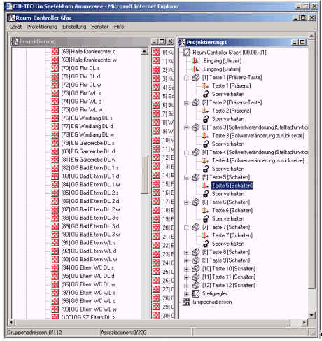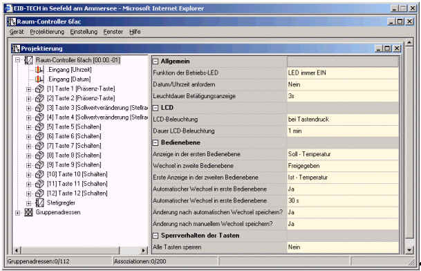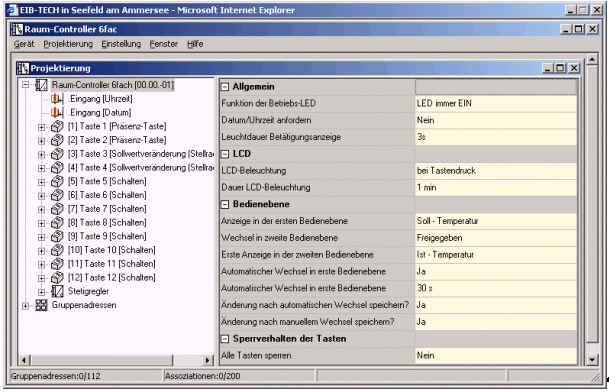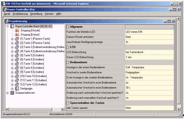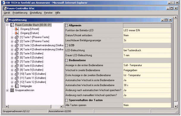 Jung Raumcontroller Bericht V 2.0 Allgemeiner Hinweis Bei diesem Bericht handelt es sich um eine überarbeitete Version eines bereits veröffentlichten Berichtes über den Raumcontroller. Aber bitte nicht vergessen: alle beschriebenen Probleme sind nun beseitigt. Bei dieser alten Version der Software gab es diverse Mängel, welche nun beseitigt wurden. Hinzu kamen noch weitere sehr hilfreiche Funktionen, wovon Sie und Ihre Kunden mit Sicherheit profitieren werden. Der Instabus EIB Raumcontroller RCD 20xx hat zwei Bedienebenen. In der ersten Bedienebene haben alle Tasten die programmierte Tastsensorfunktion. Auf dem Display kann wahlweise die aktuelle Raumtemperatur, die aktuelle Solltemperatur des Stetigreglers, die aktuelle Uhrzeit oder das aktuelle Datum angezeigt werden. Über einen langen Tastendruck (Betätigung > 5s) der beiden oberen Tasten, wechselt das Gerät in die zweite Bedienebene. In dieser Bedienebene können die Sollwerte des Stetigreglers und der Kontrast des LCD Displays verändert werden. (Quelle: Jung) Bemerkung Das in dem Raumcontroller eingebaute LCD Display ist nicht beleuchtet. Dies wird allerdings in absehbarer Zeit möglich sein. Sollten Sie Ihren Raumcontroller dann gegen einen beleuchteten austauschen wollen, funktioniert dies ohne nennenswerte Probleme. Der RCD benötigt nicht mehr Busstrom als jeder andere EIB Teilnehmer. Dies habe ich von der Firma Jung so erfahren. Die ProgrammierungDie Planung / Programmierung des Gerätes erfolgt über die ETS 2 ab der Version 1.2a, Patch 020107 sowie über eine Zusatzsoftware, welche zu jedem Raumcontroller in Form einer CD Rom mitgeliefert wird. Die Software kann auf dieser Website im Downloadbereich heruntergeladen werden. Die aktuelle Version ist die RCD_1v04j_de. Bitte verwenden Sie ausschließlich diese Software-Version; mit einer älteren Version können Fehler auftreten. Nach dem Einfügen des neuen Gerätes in die ETS 2-Software können Sie die Parameter des Gerätes einstellen und die Zuweisung der Gruppenadressen durchführen. Das Fenster der Zusatzsoftware öffnet sich dann automatisch. Die Zusatzsoftware erklärt sich von selbst, daher möchte ich nicht weiter darauf eingehen. Der Screenshot verdeutlicht dies. Neuerungen bei der Software