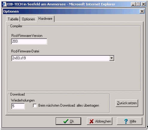Updaten der Firmware Dadurch dass die Raumcontroller Firmwareupdatefähig sind, haben Sie als Kunde den Vorteil dass Sie bei einem Update eventuell neue Funktionen haben. Dadurch profitieren Sie als Kunde, von den JUNG Weiterentwicklungen, da Sie sich für zukunftsichere EIB Geräte entschieden haben. Das Firmwareupdate kann Ihnen Ihr Systemintigrator durchführen. Je nach Rechnerleistung dauert das Firmwareupdate zwischen 8 - 15 Minuten. Aktuelle Firmwareversion herausfinden Wenn Sie herausfinden möchten welche Firmwareversion Ihr Raumcontroller hat, dann klicken Sie bitte in der ETS Projektierung auf Einstellungen Optionen, Registrierkarte Hardware: In dem Feld RCD-Firmware-Version ersehen Sie Ihre aktuelle Version. Sie können auch den Raumcontroller vom EIB trennen und nach dem erneuten anschließen des Gerätes erscheint für ca. 5 Sekunden eine Anzeige im Display bei dieser Anzeige handelt es sich um die Firmwareversion. Die aktuelle Version ist die V 2.03 © 2003 by www.eib-tech.com Helmut Lintschinger http://www.eib-tech.com/berichte/eib-home_berichte/JungRaumcontrollerBerichtV2.pdf http://www.eib-tech.com/berichte/eib-home_berichte/JungRaumcontrollerBerichtV2.zip |